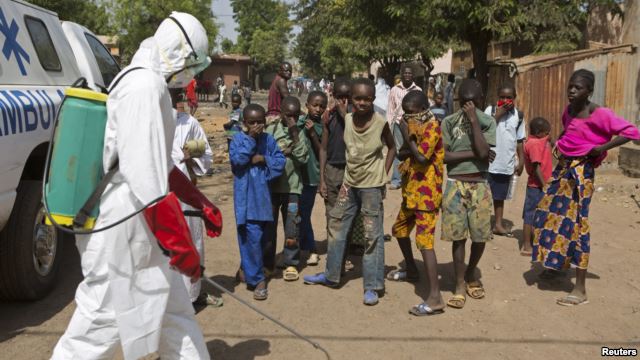 Trẻ em đang xem nhân viên y tế phun thuốc khử trùng bên ngoài nhà thờ Hồi giáo tại Bamako, Mali ngày 14/11/2014
