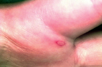 -Các ban đỏ không ngứa, tiếp sau là các vết loét có nổi bọng nước trên lòng bàn tay và bàn chân;