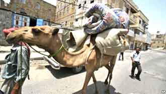 | Tập tin ảnh ngày 8/6/2011, một người đàn ông Yemen dẫn lạc đà chở đầy đồ đạc của mình ở Taiz, Yemen-nơi vi rút MERS bí ẩn đang lây nhiễm cho lạc đà ở Saudi Arabia. |
