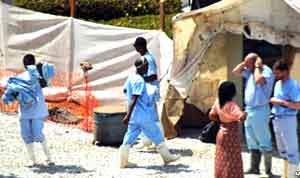 | Nhân viên y tế rảo bước tại một trung tâm cách ly cho người nhiễm Ebola tại bệnh viện Donka ở Conakry, ngày 14/4/2014 |