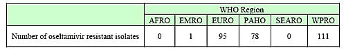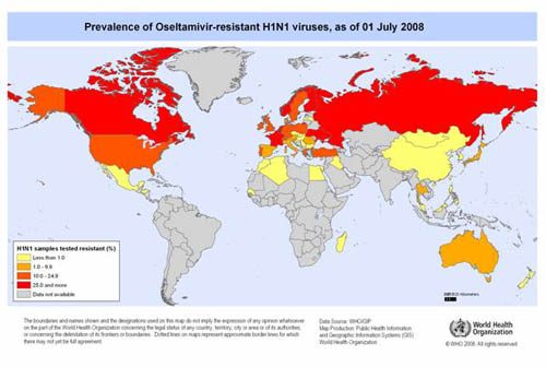 WHO đã nhận được một vài báo cáo từ các Trung tâm cúm quốc gia (National Influenza Centres_NIC) ở khu vực nửa bán cấu bắc liên quan đến virus cúm A (H1N1) kháng với oseltamivir trong thời gian đầu của cúm mùa 2008-2009 (tuần 41-44). Trong số các virus cúm A(H1N1) đượcthử nghiệm, 13/14 ca ở Anh, 1/1 ca ở Israel, 1/1 ở Ghana và 1/1 ở Canada có xuất hiện đột biến neuramidasse đặc hiệu (specific neuraminidase mutation) tại H275Y; số mã hóa theo trình tự của N1) liên quan đến kháng thuốc oseltamivir.