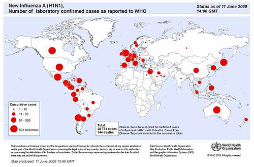 Cho đến nay đã có 137 nước và vùng lãnh thổ, trong đó có hơn 430 trường hợp tử vong vì nhiễm cúm A/H1N1. WHO cho biết, trong những đại dịch trước đây phải mất 6 tháng virus mới có thể lan ra trên một diện rộng như hiện nay, nhưng điều này đã bị virus cúm A/H1N1 "phá kỷ lục" trong vòng chưa đầy 6 tuần. Giới chuyên môn còn cảnh báo, virus cúm A/H1N1 đã trở nên nguy hiểm hơn so với các loại virus cúm thông thường do tốc độ phát triển quá nhanh hiện nay. Người ta cũng cảnh báo về nguy cơ sẽ xảy ra một cuộc chiến giành giật vaccine cúm A/H1N1 nếu tình hình không kiểm soát được. | |