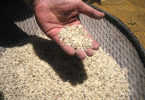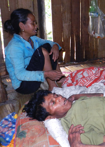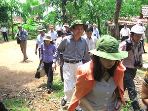 Bộ trưởng Bộ Y tế Nguyễn Thị Kim Tiến thị sát, thăm hỏi gia đình các bệnh nhân mắc Hội chứng viêm da dày sừng bàn tay, bàn chân ở xã Ba Điền, huyện miền núi Ba Tơ (Quảng Ngãi). ( Ảnh: Trí Tín) |