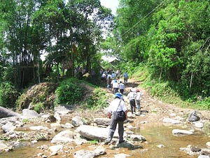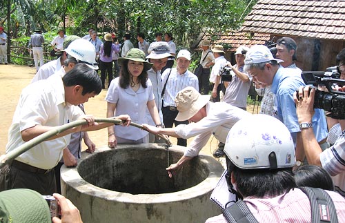 Bộ trưởng Bộ Y tế Nguyễn Thị Kim Tiến cùng Đoàn công tác của Bộ Y tế khảo sát nguồn nước sinh hoạt tại xã Ba Điền, huyện Ba Tơ, Quảng Ngãi. |