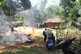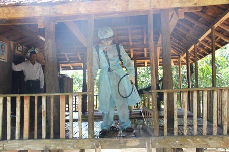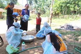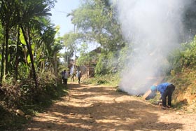 Từ 12/5 đến 13/5/2012 chiến dịch phun hóa chất diệt côn trùng và khử khuẩn môi trường được tiến hành đồng loạt tại các làng Rêu, Gò Nghênh, Hy Long và làng Tương. Trước khi phun hóa chất các lực lượng tham gia thu hồi chiếu cũ và màn rách đốt tại chỗ cùng với phân và rác thải. Cấp chiếu mới và thuốc sổ giun cho toàn bộ người dân (trừ các đối tượng không được chỉ định). Trong khi phun hóa chất để tránh chồng chéo, đội phun hóa chất khử khuẩn môi trường đi trước, sau đó đến đội phun hóa chất diệt côn trùng và tẩm màn. Vị trí phun hóa chất diệt côn trùng (Permethrine): mặt dưới sàn nhà (phun máy), mặt trên sàn nhà và xó xỉnh trong nhà (phun tay); mặt trên và xung quanh đống củi để dưới gầm sàn (phun máy); mặt đất dưới sàn nhà và chung quanh nhà (phun máy); chuồng gia súc gần nhà và bờ bụi quanh nhà (phun máy). Vị trí phun hóa chất khử khuẩn (Chloramin B): theo chỉ định phun hóa chất khử khuẩn môi trường; các hố phân gia súc đã được vùi lấp, ổ nước đọng và bãi rác quanh nhà (phun máy). Các cán bộ kỹ thuật của Viện, Trung tâm Y tế dự phòng và Trung tâm Phòng chống sốt rét phân công giám sát chặt chẽ các đội phun/tẩm để đảm bảo thực hiện triệt để đúng quy trình kỹ thuật, không bỏ sót nhà nào.