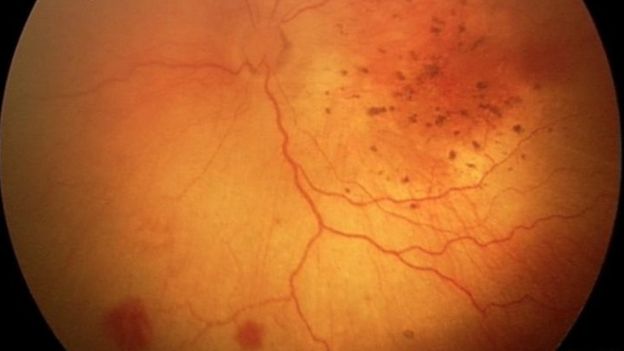 Hình ảnh cho thấy chảy máu bất thường, được gọi là xuất huyết, trong võng mạc (mặt sau của mắt)