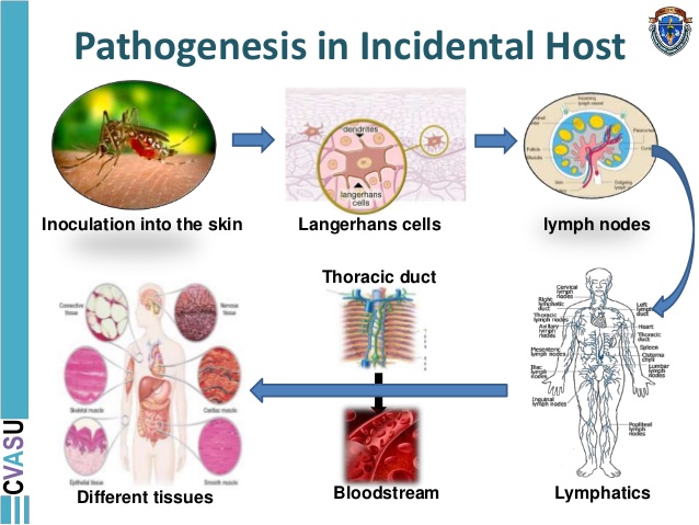- Thời kỳ lây truyền: Bệnh nhân là nguồn lây truyền ngay trước khi xuất hiện cơn sốt cho tới khi hết sốt, kéo dài trung bình khoảng 5 -7 ngày. Người mang vi-rút không triệu chứng thường có thời kỳ lây truyền ngắn hơn. Thời kỳ lây truyền của động vật nhiễm vi-rút và ốm chưa rõ, co thể kéo dài nhiều tuần. Muỗi Culex nhiễm vi-rút từ 7 ngày sau khi hút máu và có khả năng truyền bệnh suốt đời cho động vật và người.