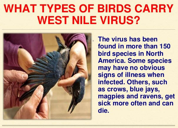 - Ổ chứa quan trọng trong thiên nhiên của vi-rút Tây sông Nin là loài ngựa và một số loài chim hoang dại như quạ, chim sẻ, ngỗng trời, vịt trời. Một số loài thú hoang dại và gia súc khác cũng có thể mang vi-rút. Chu trình "ngựa/chim - muỗi" là chu trình chính trong tự nhiên của vi-rút. Con người ngẫu nhiên nhiễm vi-rút khi tiếp cận với chu trình tự nhiên này, sau đó trở thành vật chủ phụ và hình thành nên chu trình "người-muỗi-người" tại cộng đồng đông dân cư. Trong các ổ dịch cứ 1 ca bệnh điển hình có từ 50 đến 300 trường hợp nhiễm vi-rút không triệu chứng hoặc bệnh thoảng qua.