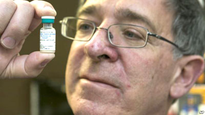 | Bác sĩ nhi khoa Charles Goodman giữ một lọ vaccine sởi-quai bị-rubella, hay vaccine MMR tại văn phòng của mình ở Northridge, California, ngày 29/1/2015 |