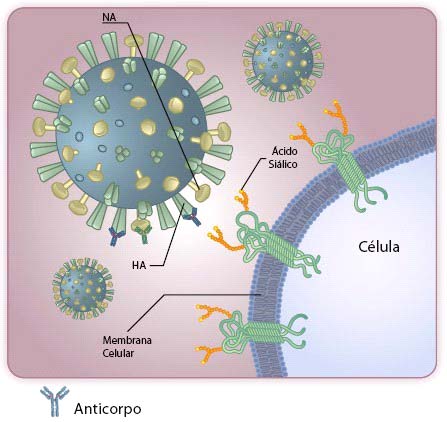 Các kháng thể tiếp xúc với hemagglutinin (HA) để ngăn chặn nó liên kết vào các acid cialic của tế bào. |