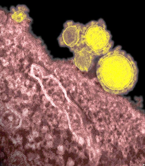 Hình ảnh kính hiển vi điện tử về chủng coronavirus (màu vàng) gây bệnh hô hấp bí hiểm này xuất hiện' ở vùng Trung Động lây lan dễ dàng hơn từ người sang người so với SARS. |