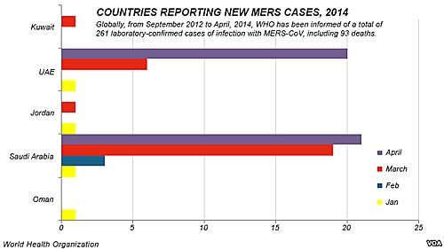 Ngày 1/5/2014. RIYADH - Ả Rập Xê út cho biết vào hôm thứ năm tổng số các trường hợp nhiễm Hội chứng hô hấp vùng Trung đông (Middle East Respiratory Syndrome_MERS), một căn bệnh mới thường gây chết người đã tăng gần gấp đôi trong vương quốc này vào tháng tư với hơn 26 ca nhiễm mới được báo cáo.