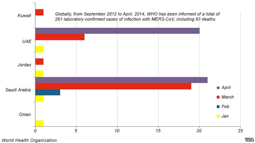Ngày 30/4/2014. GENEVA - WHO cho biết họ tin rằng sự tăng vọt các ca bệnh gây Hội chứng hô hấp vùng Trung đông (MERS) gần đây hoặc tác nhân gây bệnh là chủng coronavirus có lẽ là do sự gia tăng bệnh theo mùa chứ không phải là bất kỳ sự thay đổi nào trong hành vi của virus. Theo WHO các đợt gia tăng tương tự đã xảy ra trong cùng thời gian này trong hai năm qua. Gregory Hartl, phát ngôn viên của WHO cho biết sự gia tăng trong các ca bệnh rất có thể là do thời tiết ấm hơn ở bán đảo Ả Rập dẫn đến sự bùng phát của căn bệnh này trong hai hoặc ba bệnh viện ở Ả rập Xê út (Saudi Arabia) và Các tiểu vương quốc Ả rập thống nhất (United Arab Emirates). Ông nói rằng các quan chức y tế không biết làm thế nào virus lây truyền từ người sang người nhưng ông nói rõ ràng là căn bệnh này không lây lan dễ dàng tương tự như hội chứng hô hấp cấp tính trầm trọng, hay SARS, đã gây ra.