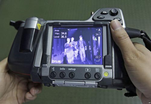 Hành khách được nhìn thấy trên một máy quét nhiệt khi họ đến sân bay quốc tế Manila tại Paranaque, phía nam Manila, Philippines, ngày 16/4/2014 |
