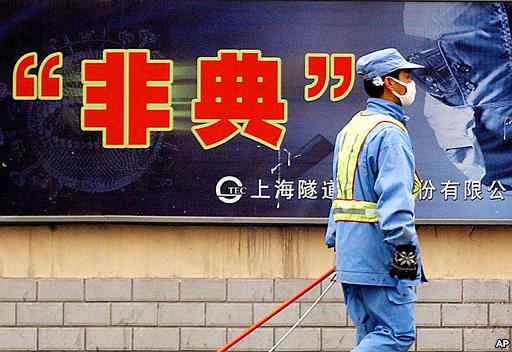 Người lao động thành phố mang khẩu trang bảo vệ đi ngang qua bảng quảng cáp chống SARS tại trụ sở chính quyền địa phương, Thượng Hải, ngày 29/12/2003 |
