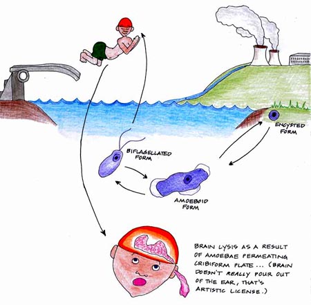 Chính xác. Nếu amip Entamoeba histolytica (gây ra bệnh kiết lỵ, tiêu chảy nêu trên - PV) có trong phân, nước bẩn, các loại rau, thực phẩm, tấn công người qua đường tiêu hóa thì amip Naegleria fowleri (amip ăn não người) lại chui vào mũi để lên não sau khi bệnh nhân bị xộc nước nhiễm nguồn bệnh. Vì vậy, rất hiếm khi xảy ra tình trạng nhiễm amip này.