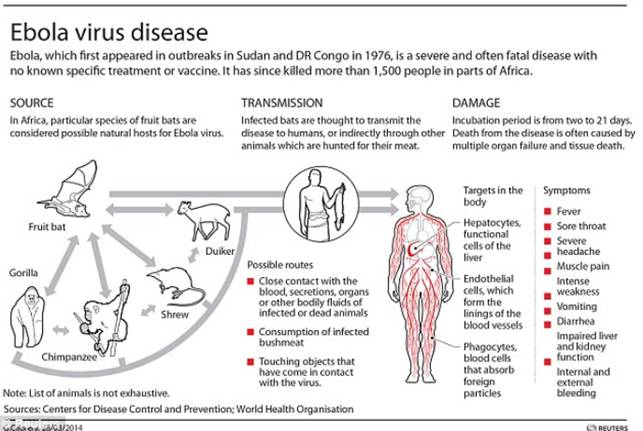 Theo Tổ chức Y tế Thế giới, Ebola là bệnh gây ra do virus. Các triệu chứng ban đầu bao gồm hiện tượng sốt đột ngột, cơ thể suy yếu trầm trọng, đau cơ và đau cổ họng. Sau đó, khi bệnh tiến triển, các triệu chứng như nôn mửa, tiêu chảy và trong một số trường hợp, bệnh nhân sẽ phải đối mặt với nguy cơ xuất huyết trong và ngoài cơ thể. Vật chủ tự nhiên của virus Ebola có thể là loài dơi ăn quả đặc biệt có khả năng lây truyền cho người. Động vật linh trưởng cũng là một nguồn lây nhiễm bệnh. Sau đó, bệnh sẽ lây lan từ người sang người qua tiếp xúc trực tiếp với máu, chất dịch cơ thể hoặc nội tạng của người nhiễm bệnh hay do tiếp xúc gián tiếp với môi trường có virus. Thậm chí, đám tang của nạn nhân Ebola cũng có thể là nơi nhiễm bệnh nếu người dự tang lễ tiếp xúc trực tiếp với thi thể người chết. Thời kỳ ủ bệnh có thể kéo dài từ hai ngày đến 3 tuần và việc chẩn đoán rất khó. Cho tới nay, bệnh Ebola chủ yếu chỉ xuất hiện ở châu Phi mặc dù một chủng khác đã xuất hiện ở Philippines. Nhân viên y tế cũng dễ dàng nhiễm bệnh nếu họ làm việc mà không tuân thủ các biện pháp phòng ngừa nghiêm ngặt để tránh lây nhiễm. Đến nay, 100 cán bộ y tế đã nhiễm virus Ebola.