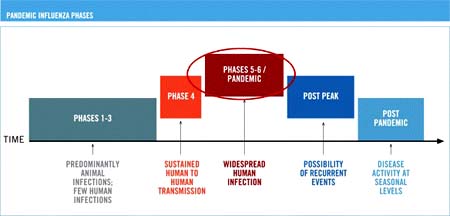 Phase 5 với đặc trưng có sự lan truyền người-người xuyên qua ít nhất 2 quốc gia (Vùng WHO quản lý) trong khi phần lớn các quốc gia khác không bị ảnh hưởng ở giai đoạn này. Công bố Phase 5 là dấu hiệu mạnh mẽ cho thấy đại dịch sắp xảy ra.