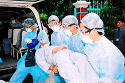 Hình ảnh buổi diễn tập cấp cứu bệnh nhân nhiễm cúm A (H1N1) 1. Tại sân bay Nội Bài 2. Phun thuốc khử khuẩn diệt mầm bệnh.Ảnh: Anh Tuấn 3. tại Bệnh viện Bắc Thăng Long - Hà Nội. Ảnh: Trần Minh 4. Khám cho bệnh nhân tại cụm dân cư.Ảnh: Anh Tuấn |