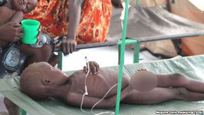 | Một đứa trẻ được điều trị với phẩy khuẩn tả ở Nam Sudan, suy dinh dưỡng do khủng hoảng đang diễn ra trong nước làm cho nhiều trẻ em dễ bị bệnh và giết chết 27 người vào ngày 2/6/2014 |