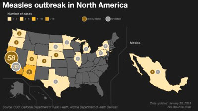 Dịch bệnh sởi cách đây vài tuần tại Disneyland ở Đông Nam California đã tập trung tâm trí và các mối quan tâm sâu sắc như thể một công viên giải trí trở thành một vương quốc thảm kịch. Theo CDC, hàng chục ca bệnh sởi lây lan trên khắp California. Arizona và các bang gần đó đãbáo cáo sự bùng phát của căn bệnh gây khó chịu mà các giới chức đã tuyên bố bị xóa sổ cơ bản tại quốc gia này gần đây nhất vào năm 2000 nhưng nó đã xuất hiện trở lại, có 644 ca bệnh ở 27 bang. Tốc độ phát triển dịch bệnh vẫn tiếp tục trong tháng Một, số ca mắc có thể cao hơn trong năm 2015. Mặc dù chưa có ca bệnh nào tử vong trong vụ dịch này nhưng khả năng gây tử vong là không thể xem thường, nếu lấy quá khứ làm bài học thì một hay hai người trong 1000 ca bệnh sẽ không sống sót.