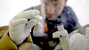 Nhà khoa học phân cách các tế bào máu từ tế bào huyết tương để phân lập bất kỳ RNA củaEbolanhằm xác định virus tại phòng thí nghiệm di động châu Âu tạiGueckedou, Guinea, tháng 4/2014 |