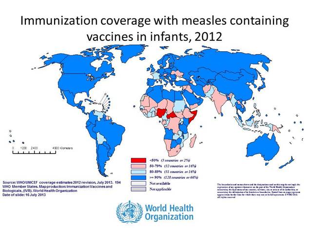 ·Trong năm 2012, khoảng 84% trẻ em trên thế giới được tiêm một liều vaccine sởi này trong năm đầu tiền chào đời thông qua các dịch vụ chăm sóc sức khỏe định kỳ - tăng so với 72% trong năm 2000;