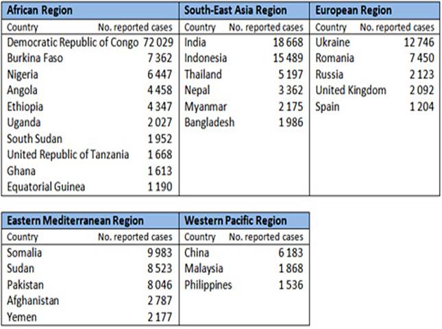 Sởi là bệnh vẫn còn phổ biến ở nhiều nước đang phát triển - đặc biệt là ở các khu vực của châu Phi và châu Á. Hơn 20 triệu người bị ảnh hưởng bởi bệnh sởi mỗi năm. Đại đa số (hơn 95%) bệnh sởi tử vong xảy ra ở các nước có thu nhập bình quân đầu người thấp và cơ sở hạ tầng y tế yếu kém.