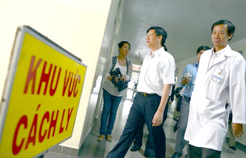 Thứ trưởng Bộ Y tế Nguyễn Thanh Long (giữa) kiểm tra khu cách ly được Bệnh viện Bệnh nhiệt đới TP.HCM chuẩn bị để đối phó với dịch cúm A/H7N9 chiều 9-4 Ảnh: THUẬN THẮNG |