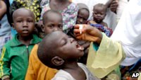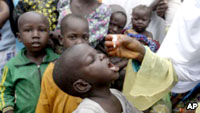 Một nhân viên y tế cho trẻ em uống vaccine bại liệt tại một trại dành cho những người tỵ nạn