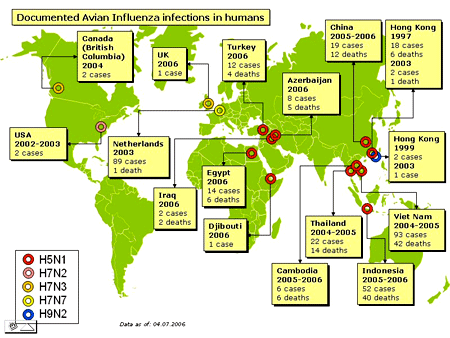 Tại Việt Nam, vụ dịch cúm gia cầm đầu tiên xuất hiện ngày 6.12.2006, thông tin về các bênh nhân, vụ dịch và số tỉnh thành, địa phương, vùng địa lý có cúm gia cầm được cập nhật hàng ngày. Hiện nay, virus cúm gia cầm lan truyền rộng khắp các quốc gia và ít có khả năng virus này sẽ bị loại trừ trong vài năm tới. Chừng nào virus cúm gia cầm còn dai dẳng trong quần thể gia cầm, thì vẫn còn những hiểm hoạ cho loài người.
