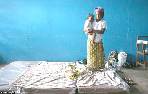 Hai mẹ con đứng trên một tấm nệm trong một trung tâm cách ly Ebola ở Liberia