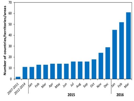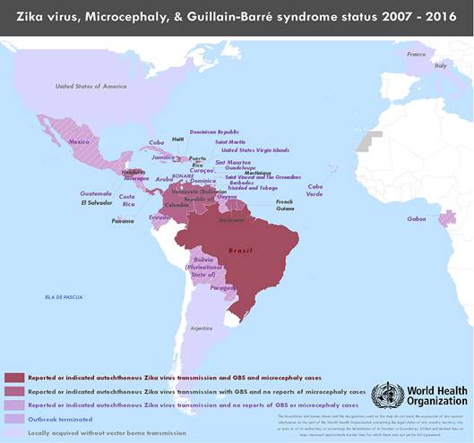 Ngày 24/3/2016. Cập nhật dịch bệnh do virus Zika (Zika Outbreak Updated) tháng 3/2016, Tổ chức Y tế thế giới (WHO) ghi nhận 61 quốc gia và vùng lãnh thổ có lưu hành hoặc lây truyền dịch bệnh do vi rút Zika từ tháng 1/2007 đến tháng 3/2016, trong đó 5 quốc gia thông báo có virus Zika lây lan qua đường tình dục. WHO tiếp tục khẳng định dịch bệnh do vi rút Zika là tình trạng khẩn cấp toàn cầu và ngày càng có nhiều bằng chứng khoa học về mối liên quan giữa nhiễm vi rút Zika chứng đầu nhỏ ở trẻ sơ sinh, hội chứng viêm đa rễ dây thần kinh (Guillain-Barré).