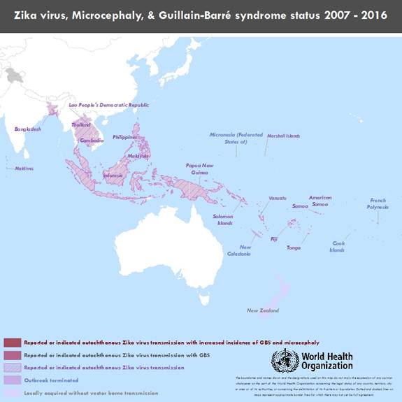 - Có sự lưu hành vi rút Zika nhưng không có báo cáo về chứng đầu nhỏ và hội chứng GBS: khu vực châu Phi 2 nước Cape Verde, Gabon; khu vực Đông Địa Trung Hải/khu vực châu Mỹ gồm 22 nước Aruba, Barbados, Bolivia, Bonaire-Netherlands, Costa Rica, Cuba, Curaçao, Dominica, Cộng hòa Dominican, Ecuador, Guadeloupe, Guatemala, Guyana, Jamaica, Mexico, Nicaragua, Paraguay, Saint Martin, Saint Vincent and the Grenadines, Sint Maarten, Trinidad & Tobago, Quần đảo Virgin (Hoa Kỳ); khu vực Đông Nam Á gồm 4 nước Bangladesh, Indonesia, Maldives, Thái Lan; khu vực Tây Thái Bình Dương gồm 13 nước American Samoa, Campuchia, Micronesia, Fiji, Lào, Malaysia, Marshall Islands, Papua New Guinea, Philippines, Samoa, Solomon Islands, Tonga, Vanuatu.