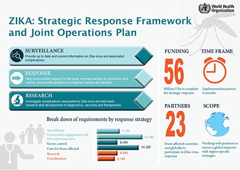Khung chiến lược này tập trung vận động và điều phối các đối tác, chuyên gia và nguồn lực giúp các quốc gia tăng cường giám sát virus Zika và các rối loạn có thể được liên kết với nó, cải thiện điều khiển vector, giao tiếp hiệu quả rủi ro, hướng dẫn và bảo vệ các biện pháp, cung cấp chăm sóc y tế cho những người bị ảnh hưởng và nghiên cứu theo dõi nhanh và phát triển các loại vắc-xin, chẩn đoán và phương pháp điều trị. WHO cho rằng cần thiết có 56 triệu USD để thực hiện Khung chiến lược và kế hoạch hành động này, trong đó 25 triệu USD sẽ tài trợ cho WHO và các Văn phòng khu vực châu Mỹ chủa WHO (AMRO/PAHO) và 31 triệu USD sẽ tài trợ cho công việc của các đối tác quan trọng. Trong thời gian đó, WHO đã khai thác một quỹ dự phòng khẩn cấp mới được thành lập để tài trợ cho hoạt động ban đầu của nó, là một phần của chương trình khẩn cấp mới của WHO trụ sở chính của cơ quan này kích hoạt một hệ thống quản lý sự cố để giám sát các phản ứng toàn cầu và chuyên môn đòn bẩy từ khắp các tổ chức để giải quyết cuộc khủng hoảng. AMRO/PAHO đã làm việc chặt chẽ với các nước bị ảnh hưởng kể từ tháng 5/2015, khi các báo cáo đầu tiên của bệnh virus Zika nổi lên từ vùng đông bắc Brazil.