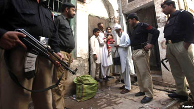 Cảnh sát đứng gác khi một cán bộ tham gia phòng chống bại liệt chờ đợi để cho trẻ em uốngvài giọt vắc xin bại liệt tại Peshawar, tỉnh Khyber-Pakhtunkhwa, Pakistan, ngày 30/3/2014
