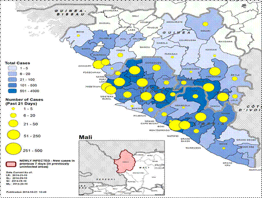 Tổ chức Y tế thế giới (WHO) cho biết số ca mắc và tử vong do vi rút Ebola (EVD) đang có dấu hiệu chững lại ở 3 quốc gia Tây Phi, một số ca nghi ngờ đã được WHO loại trừ trong báo cáo trước đây. Theo đó đến ngày 2/11/2014 đã có 13.633 ca mắc thay vì 13.769 như báo cáo trước đây, trong đó 5.000 tử vong: Liberia (6.535 ca mắc, 2.413 tử vong); Sierra Leone (5.338 ca mắc, 1.510 tử vong); Guinea (1.667 ca mắc, 1018 tử vong); Mali (1 ca mắc, 1 tử vong); Nigeria (20 ca mắc, 8 tử vong); Senegal (1 ca mắc, 0 tử vong); DRC (66 ca mắc, 49 tử vong); Tây Ban Nha (3 ca mắc, 2 tử vong); Hoa kỳ (4 ca mắc, 1 tử vong); trong số 531 trường hợp là nhân viên y tế mắc bệnh thì có 277 tử vong.