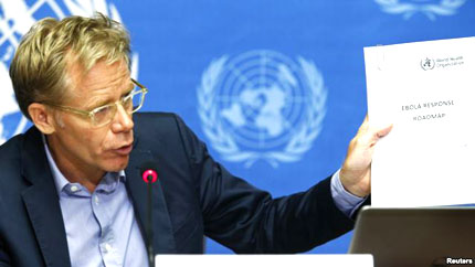 | Bruce Aylward-Trợ lý Tổng Giám đốc WHO giới thiệu tài liệu "Lộ trình đáp ứng Ebola" (Ebola response roadmap) trong một cuộc họp báo tại trụ sở U.N ở Geneva, ngày 28/8/ 2014 |