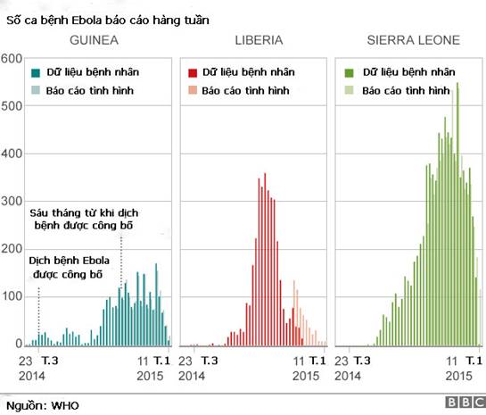 Ngày 22/01/2015. VOA News. Số ca nhiễm mới Ebola giảm mạnh tại Tây Phi (Big Drop in New Ebola Cases in West Africa).Số ca mắc mới Ebola giảm mạnh trong tuần qua, tăng niềm hy vọng dịch bệnh trong khu vực sẽ chấm dứt. WHO cho biết có 145 ca mắc mới được báo cáo tại Guinea, Liberia và Sierra Leone trong tuần đến ngày 18/01. Chỉ có 8 ca mắc mới từ Liberia, một con số rất nhỏ so với 300-400 ca mỗi tuần trong tháng 8 và 9/2014. Mặc dù 117 ca mắc mới được ghi nhận tại Sierra Leone nhưng WHO cho rằng tại đó số ca mắc mới “đang giảm nhanh” (decreasing quickly), theo đó con số gần đây nhất cho thấy giảm hơn 50% so với 2 tuần trước. Tổng số ca tử vong do Ebola là 8.641 ca, trong số 21.700 ca mắc.