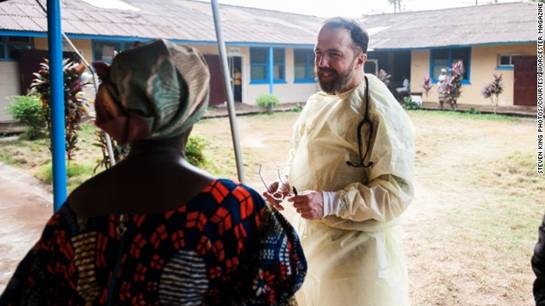 CNN Health, ngày 18/1/2015 - Những ghi chép của bác sĩ:Bác sĩ người Mỹ sống sót khỏi Ebola quay trở lại Liberia (Doctor's notes: American Ebola survivor is back in Liberia). Chà! Tối chủ nhật, bây giờ là 9 giờ 30 phút tối và tôi mệt lử. Có thể ngủ gật đi mất. Chắc tôi sẽ tìm ra cách để xem đội Patriots chơi trong trận đấu quyết định giải AFC ngày mai (trận đấu sẽ bắt đầu vào lúc 11:40 tối giờ địa phương).