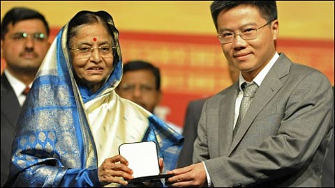 Bà Pratibha Patil-Tổng thống Ấn Độ trao huy chương Fields-giải thưởng toán học cao quý nhất thế giới cho GS. Ngô Bảo Châu. |