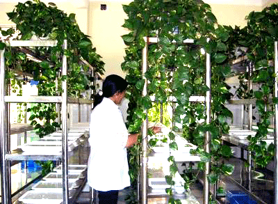 Ngược hẳn với thời tiết oi nồng bên ngoài, phòng nuôi muỗi là một không gian thoáng mát bởi hàng trăm chậu cây xanh và dây leo. Ban đầu, việc trồng cây xanh trong phòng nuôi chỉ là sở thích, nhưng sau đó, các chị nhận thấy đây cũng chính là nhu cầu của muỗi, phải sống trong môi trường có độ ẩm cao, gần giống như sinh cảnh tự nhiên ở vùng rừng núi.