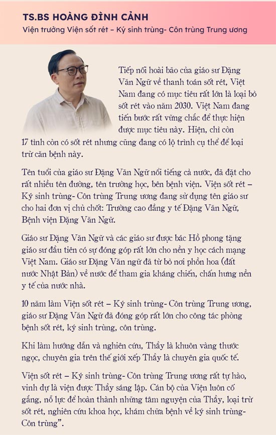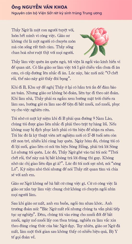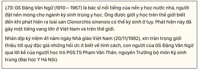 Tôi tự hỏi mình: Từ năm 1936 Thầy đã tự nguyện vào bộ môn ký sinh trùng tại Trường Y Khoa Đông Dương (tiền thân của trường Đại học Y Hà Nội). Sau này, Thầy được đi học tại Nhật, làm với người Nhật, người Mỹ. Đáng ra ở vị trí như Thầy khi về nước sẽ có cơ hội kiếm được nhiều tiền và dễ nổi tiếng hơn, nhưng Thầy vẫn theo đuổi ngành ký sinh trùng. Tôi tự suy nghĩ kỹ lại và quyết tâm theo học Thầy.Ngọc Minh: Điều gì khiến ông nể phục nhất ở giáo sư Đặng Văn Ngữ?