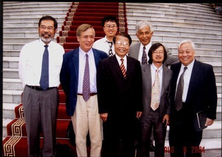 Nguyên Chủ tịch nước Trần Đức Lương và GS Nguyễn Văn Hiệu thân mật tiếp các nhà vật lý Việt Nam ở nước ngoài về Hà Nội dự Gặp gỡ Việt Nam. Từ trái sang phải: GS Trần Minh Tâm (Thụy Sĩ), GS Trịnh Xuân Thuận (Mỹ), GS Đàm Thanh Sơn (Mỹ), GS Trần Thanh Vân (Pháp) và GS Phạm Quang Hưng (Mỹ) |