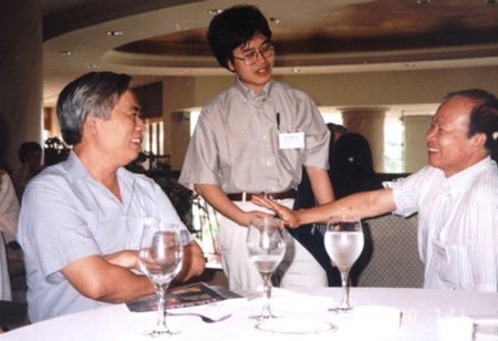 GS Trịnh Xuân Thuận (trái) thân mật trò chuyện với GS Đàm Thanh Sơn (giữa, Đại học Washington) và GS Phạm Xuân Yêm (Đại học Paris 7) tại Gặp gỡ Việt Nam năm 2000. |