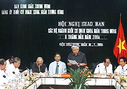 GS Đỗ Nguyên Phương đọc báo cáo đề dẫn tại Hội nghị giao ban định kỳ lần này do Ban Khoa giáo Trung ương tổ chức nhằm đánh giá kết quả phối hợp hoạt động công tác 6 tháng đầu năm 2004 ( GS.TS Đỗ Nguyên Phương, Trưởng ban Khoa giáo Trung ương cho biết: 6 tháng qua, Ban Khoa giáo Trung ương đã phối hợp chặt chẽ và có hiệu quả với các bộ, ngành thuộc khối thực hiện thành công các nhiệm vụ nghiên cứu đề xuất; thẩm định; hướng dẫn, kiểm tra, chỉ đạo các hoạt động trong lĩnh vực khoa giáo; thực hiện đúng tiến trình của các đề án được giao thuộc chương trình làm việc của Bộ Chính trị, Ban Bí thư trong năm 2004, điển hình là hoàn thành sơ kết Chỉ thị 45 của Trung ương về "Đẩy mạnh các hoạt động của Liên hiệp các Hội Khoa học kỹ thuật Việt Nam"; phối hợp cùng Bộ Giáo dục & Đào tạo xây dựng đề án "Xây dựng đội ngũ nhà giáo và cán bộ quản lý giáo dục"; phối hợp với Bộ Tài Nguyên & Môi trường để hoàn thiện dự thảo lần thứ nhất Báo cáo Tổng kết 10 năm thực hiện Luật Bảo vệ môi trường và 6 năm thực hiện Chỉ thị 36 của Bộ Chính trị về bảo vệ môi trường trong thời kỳ đẩy mạnh CNH - HĐH đất nước; phối hợp với Bộ Y tế và Ủy ban Dân số, Gia đình & Trẻ em triển khai xây dựng dự thảo Nghị quyết của Bộ Chính trị về chăm sóc sức khỏe nhân dân và dự thảo Nghị quyết của Bộ Chính trị về công tác dân số, kế hoạch hóa gia đình trong tình hình mới...) |