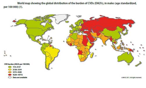 ·Các quốc gia có thu nhập thấp và trung bình bị ảnh ảnh hưởng nhiều nhất, với hơn 80% các trường hợp tử vong liên quan đến bệnh tim mạch xảy ra ở các nước thu nhập thấp và trung bình và hầu như các trường hợp tử vong xảy ra ở nam giới và phụ nữ như nhau;