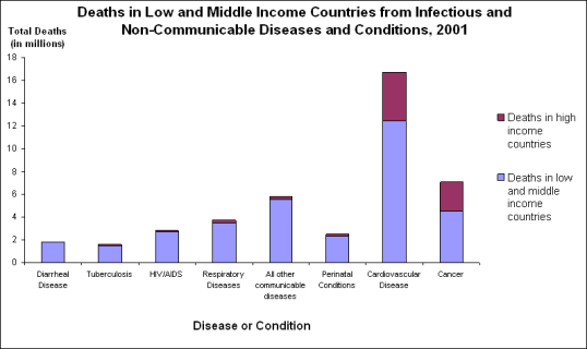 + Trên 80% số ca tử vong do những bệnh tim mạch trên thế giới xảy ra ở các nước có thu nhập thấp và trung bình. Người dân ở các nước có thu nhập thấp và trung bình thường xuyên tiếp xúc hoặc phơi nhiễm với yếu tố nguy cơ như hút thuốc lá, dẫn đến các bệnh tim mạch và các bệnh không lây nhiễm khác. Đồng thời, họ không được hưởng lợi từ các chương trình dự phòng so với những người ở các nước thu nhập cao;