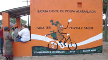 | Một kiosk quảng bá khoai lang ruột màu vàng cam được nhìn thấy ở Mozambique. (Ảnh - HarvestPlus) |