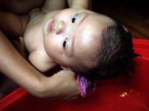 Thật sai lầm khi một số mẹ cố gắng kỳ cọ mạnh tay để loại bỏ ‘cứt trâu’ trên đầu bé. (Ảnh minh họa). “Cứt trâu” cũng có thể gặp ở những trẻ bị bệnh viêm da cơ địa. Ngoài biểu hiện “cứt trâu”, trẻ còn có những vùng da khi sần, nhiều mụn nhỏ li ti, gặp nhiều ở má, trán… xuất hiện nhiều đợt dù được điều trị.